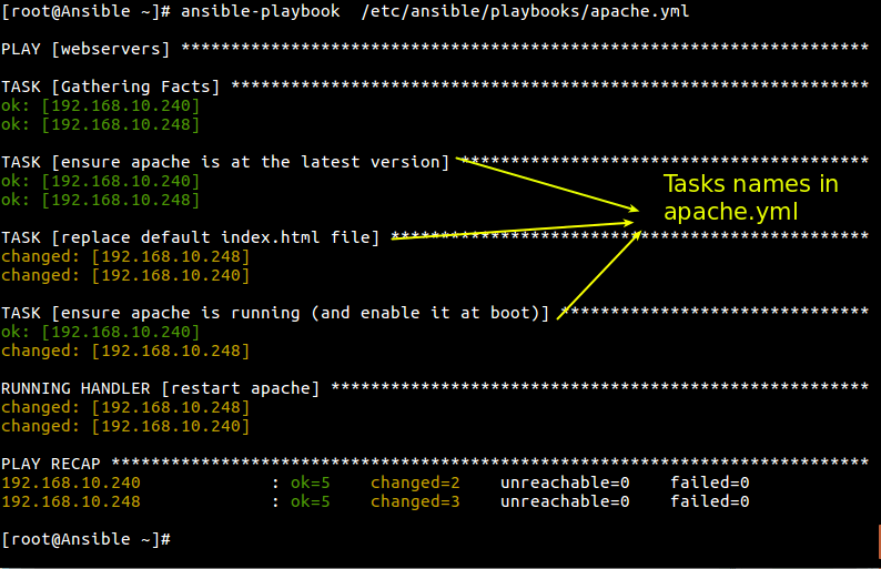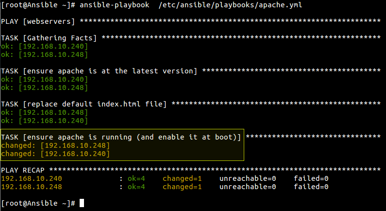 # ansible-playbook /etc/ansible/playbooks/apache.yml