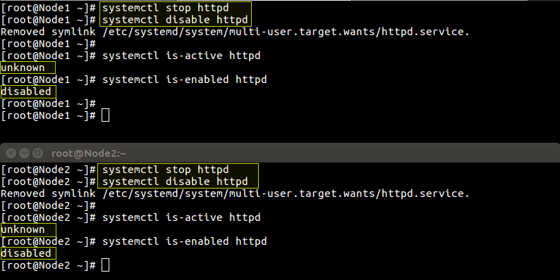 یک مرحله جلوتر میرویم و به صورت دستی apache را روی node1 و node2 متوقف و غیرفعال میکنیم.
