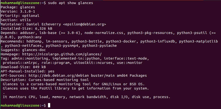 دستور زیر به شما کمک میکند که لیست تمام فایل هایی که دارای بسته ای به نام glances (ابزار مانیتورینگ پیشرفته لینوکس) میباشد را نمایش دهد.