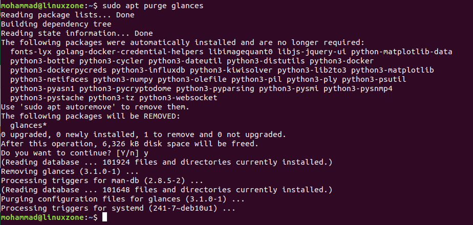 زمانیکه شما یک پکیج جدید را در سیستم تان نصب میکنید، پیش نیازهای آن هم نصب خواهد شد و آنها به همراه پکیج های دیگر از برخی کتابخانه های سیستم استفاده خواهند کرد. بعد از حذف آن پکیج خاص، پیش نیازهای نصب شده آن در سیستم باقی خواهند ماند، از این رو برای حذف آنها از دستور autoremove همانند زیر استفاده کنید.