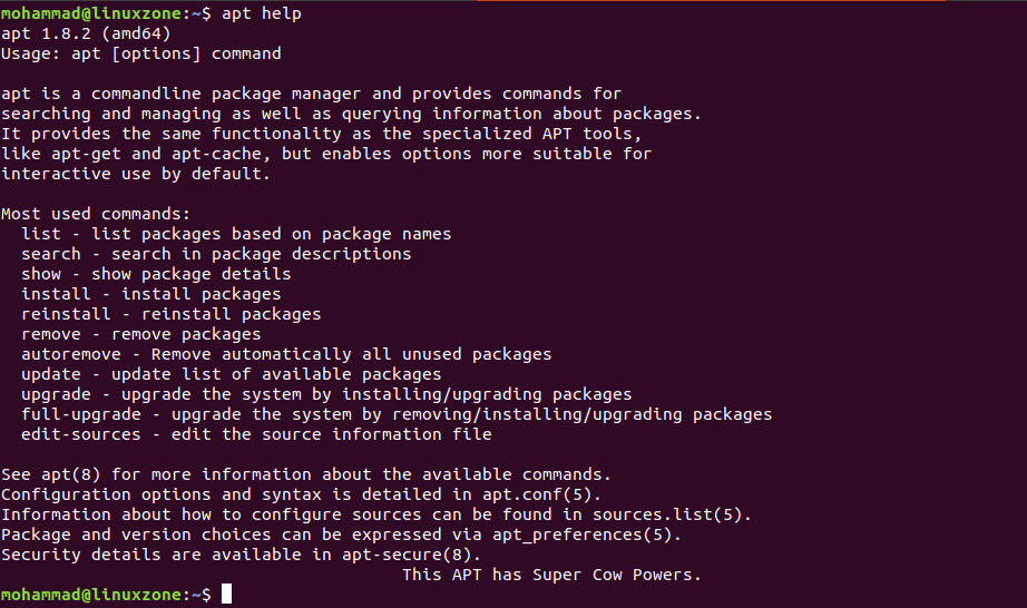 دستور زیر تمام آپشن ها به همراه توضیحات نحوه استفاده از دستور APT در سیستم تان را برای شما نمایش میدهد.