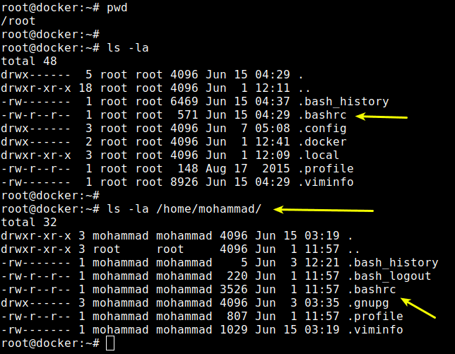 اینکه مسیر کامل دایرکتوری ها و نام آنها یا حتی چه رنگی باشند و چطور نمایش داده شوند همه این موارد در فایل .bashrc موجود در دایرکتوری home هر کاربر مشخص شده که این فایل مخفی هست و برای دیدن اون میتونید از دستور ls و آپشن la استفاده کنید. مثلا برای یوزر root و mohammad هر کدام به صورت جداگانه این فایل را در دایرکتوری home خود دارند :