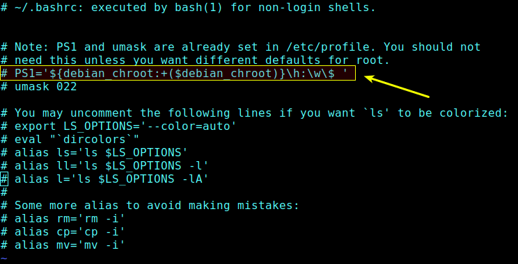 توی این فایل .bashrc یک متغییری به نام PS1 وجود داره که میتونید یکسری تغییرات در نحوه نمایش مسیر دایرکتوری ها و حتی رنگ آنها ایجاد کنید. برای اینکه بدونید این متغییر PS1 چه کانفیگ هایی داره میتونید از دستور echo $PS1 استفاده کنید.