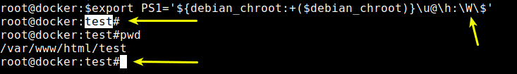 صورت مسئله دوم این هست که شما نمیخواید به صورت کامل مسیر فولدرها رو در ترمینال لینوکس حذف کنید. مثل شما به مسیر /var/www/html/test/ رفتید و میخواید در ترمینال بعد از username و hostname نام آخرین دایرکتوری (دایرکتوری test) را نمایش بده. برای انجام این کار کافیست به جای اینکه در دستور بالا w را به صورت کامل حذف کنید، از W (دبیلیو بزرگ) به جای w (دبیلیو کوچک) استفاده کنید.