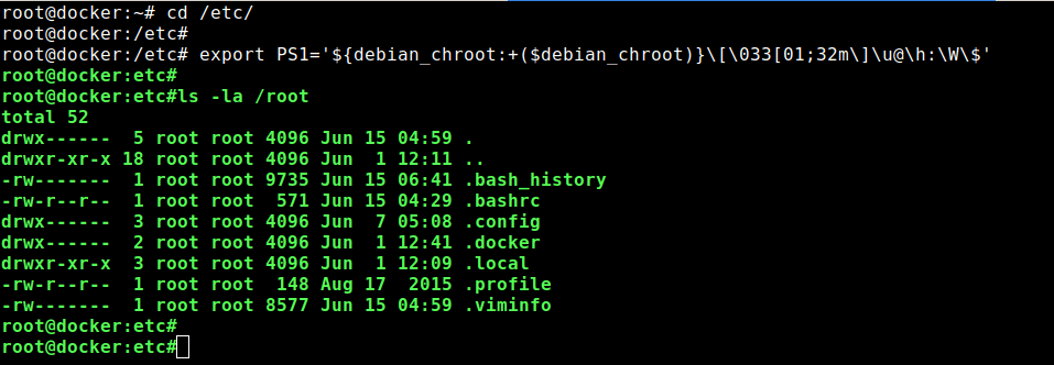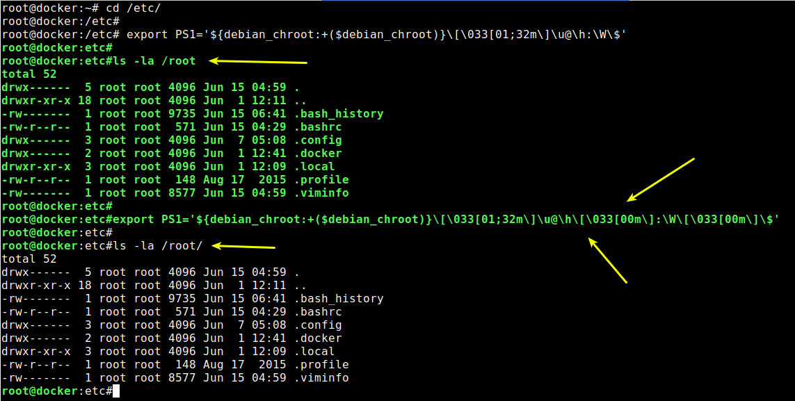 مورد بعدی ما فرض میکنیم شما میخواهید رنگ نام کاربری و نام کامپیوتر (یا هاست نیم) یا رنگ دستوراتی که وارد میکنید را نیز تغییر دهید. برای این کار باز هم میبایست با متغییرهای u@\h در خط PS1 بازی کنیم. در اینجا u به معنی username میباشد (که در اینجا root هست) و h هم به معنی hostname است (که در سرور من docker ذکر شده) و علامت @ هم که username و hosname من را از هم جدا میکند.