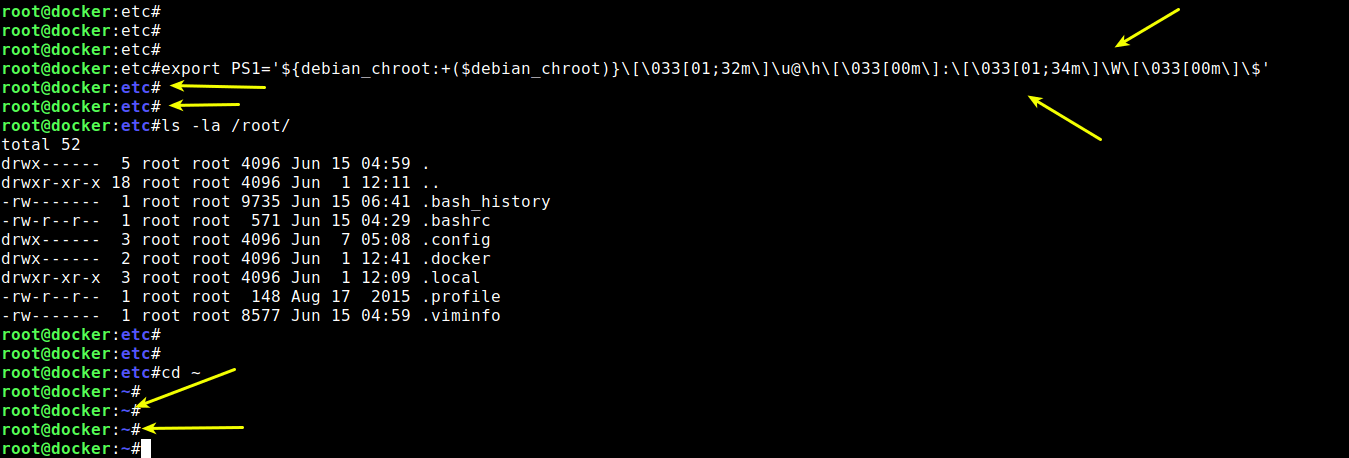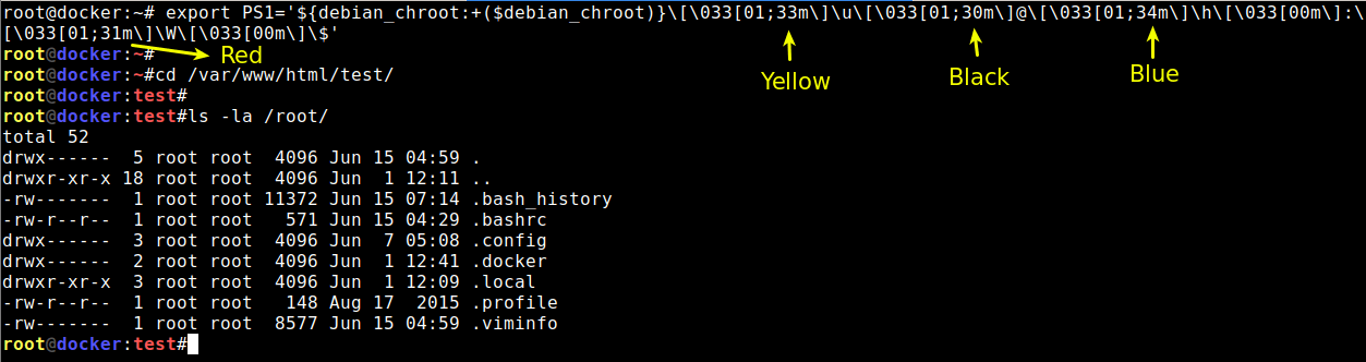 در دستور بالا من تعریف کردم که username با رنگ زرد، علامت @ با رنگ سیاه، hostname با رنگ آبی، مسیر دایرکتوری ها با رنگ قرمز و دستورات با رنگ سفید نمایش داده شوند.