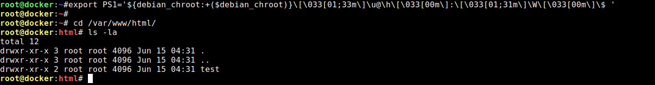 همانند عکس بالا، بعد از زدن دستور export مسیر دایرکتورهایی که طی کردید (/var/www/html/test/) را دیگر در ترمینال نمایش نمیدهد. برای مطمئن شدن از اینکه در آن مسیر هستید میتوانید از دستور pwd استفاده کنید.
