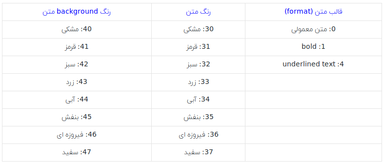 این سه متغیر در این دنباله (background ،format ,text color) با استفاده از کاما از یکدیگر جدا شده اند، در صورتی که یکی از مقادیر را وارد نکرده باشید از مقدار پیشفرض آن استفاده می شود.