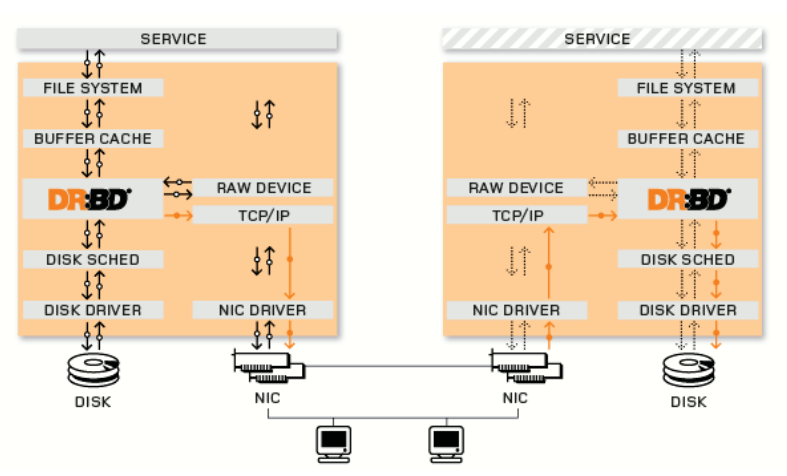در تصویر بالا 2 مربع نارنجی نمایشگر 2 سروری هستند که یک HA cluster را تشکیل میدهند. هر کدام از آنها شامل component های معمولی یک Linux TM Kernel همانند file system, buffer cache, disk scheduler, disk drivers, TCP/IP stack و network interface card (NIC) driver میباشند.